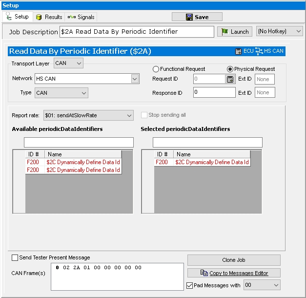 The last setup step is to request the Dynamic Identifier. This data can be accessed using the Read Data By Periodic Identifier service ($2A). In Setup Diagnostics add a ISO 14229 > Read Data By Periodic Identifier service ($2A). Next, setup the ECU ID and the network. Set the Report Rate set to the speed you want the Dynamic Identifier to report at. To link the Dynamic Identifier to the Read Data by Periodic Identifier service, click on the + button next to the Dynamically Define Data Identifier service that was set up in the previous step.