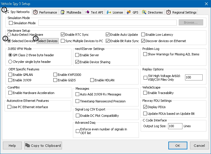 Make sure the menu is on the Spy Networks tab (Figure 1:) and then check the "Selected Devices" bubble (Figure 1:) to enable the Select Devices button (Figure 1:).