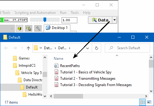 For the purpose of organization and quick access to data, Vehicle Spy will automatically store setup files and data files in the user's data directory. Each user has their own unique data directory. The data directory is created when the user logs on as they start Vehicle Spy. The name of the directory is the same as the name entered in the Logon dialog. So, for a user logged on as Jane Doe, her directory would also be called Jane Doe. By clicking the Data button found in the upper right of the user interface, the data directory will automatically open for the user that is currently logged onto Vehicle Spy (Figure 1). The same window can be opened by selecting File > Explore Data Directory on the main menu. The user's data directory is a sub directory of the Vehicle Spy Data Directory. So for user Jane Doe, the location of the data directory would be: &#xNAN;"C:\Program Files\Vehicle Spy 3\Data Directory\Jane Doe\" (Assuming Vehicle Spy was installed to C:\Program Files\Vehicle Spy 3\) If you delete a user's data directory, that user's logon will also be deleted. Notice that the files in a user's data directory will also be displayed in the Vehicle Spy Logon. It is possible to easily browse through and access files there as well.