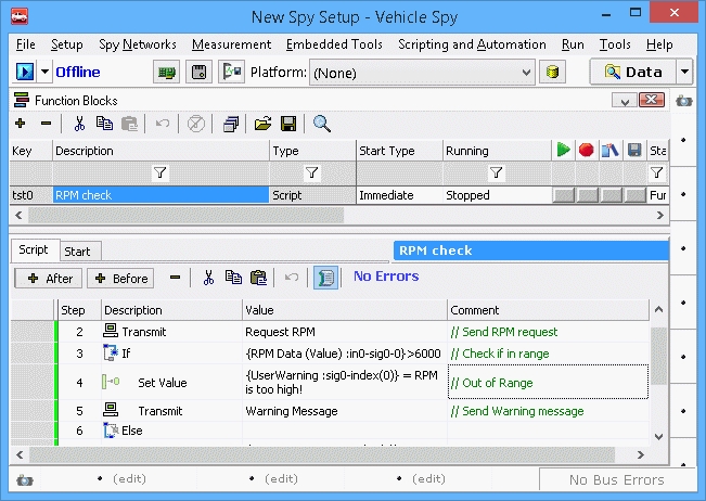 Test automation refers to automatically testing electronic modules. Test automation involves being able to send messages, receive messages, capture buffers, and react to incoming data. Vehicle Spy has tools designed to simplify the automation creation process. One tool is called a Function Blocks. Function blocks allow for simple mouse driven scripting and data capture. Another Vehicle Spy automation tool is C Code Interface. C Code interface gives the ability to add C Code to access functions outside Vehicle Spy and bring that information and control into Vehicle Spy.
