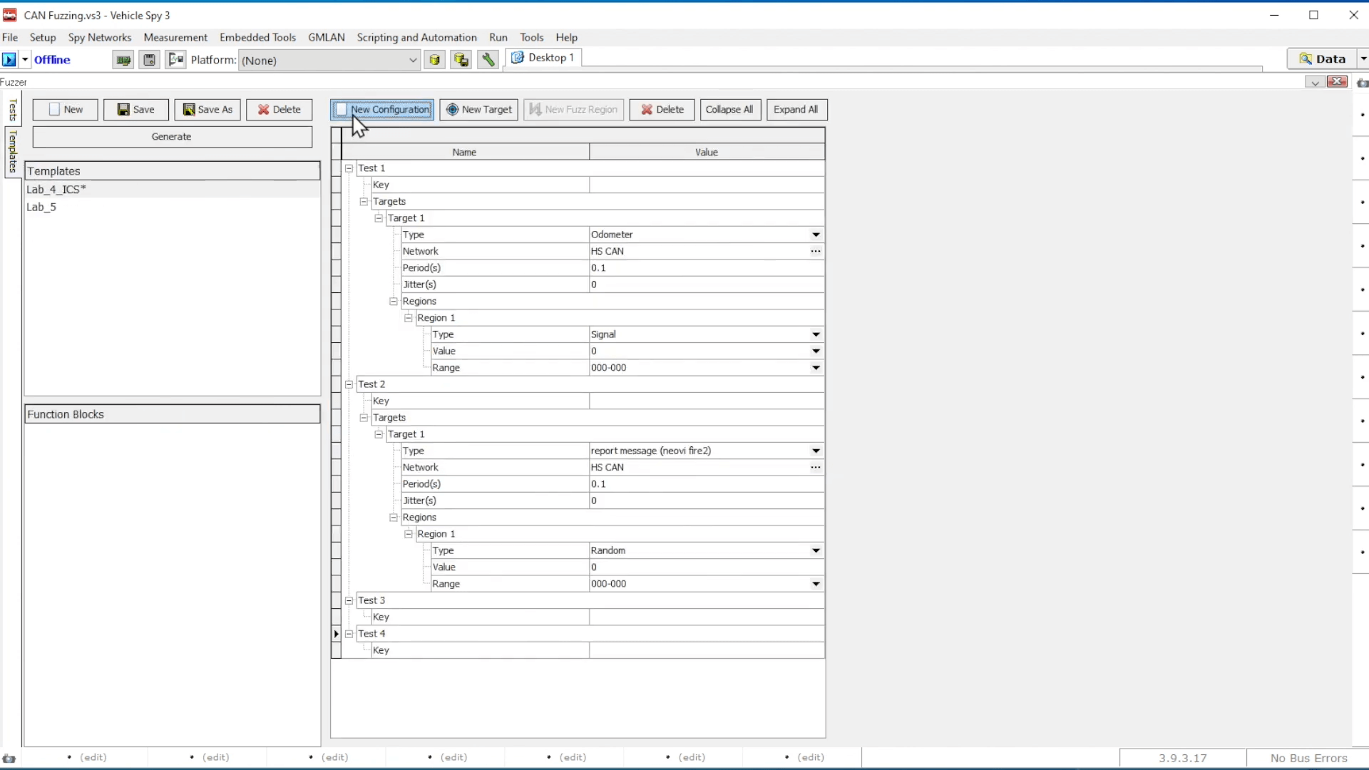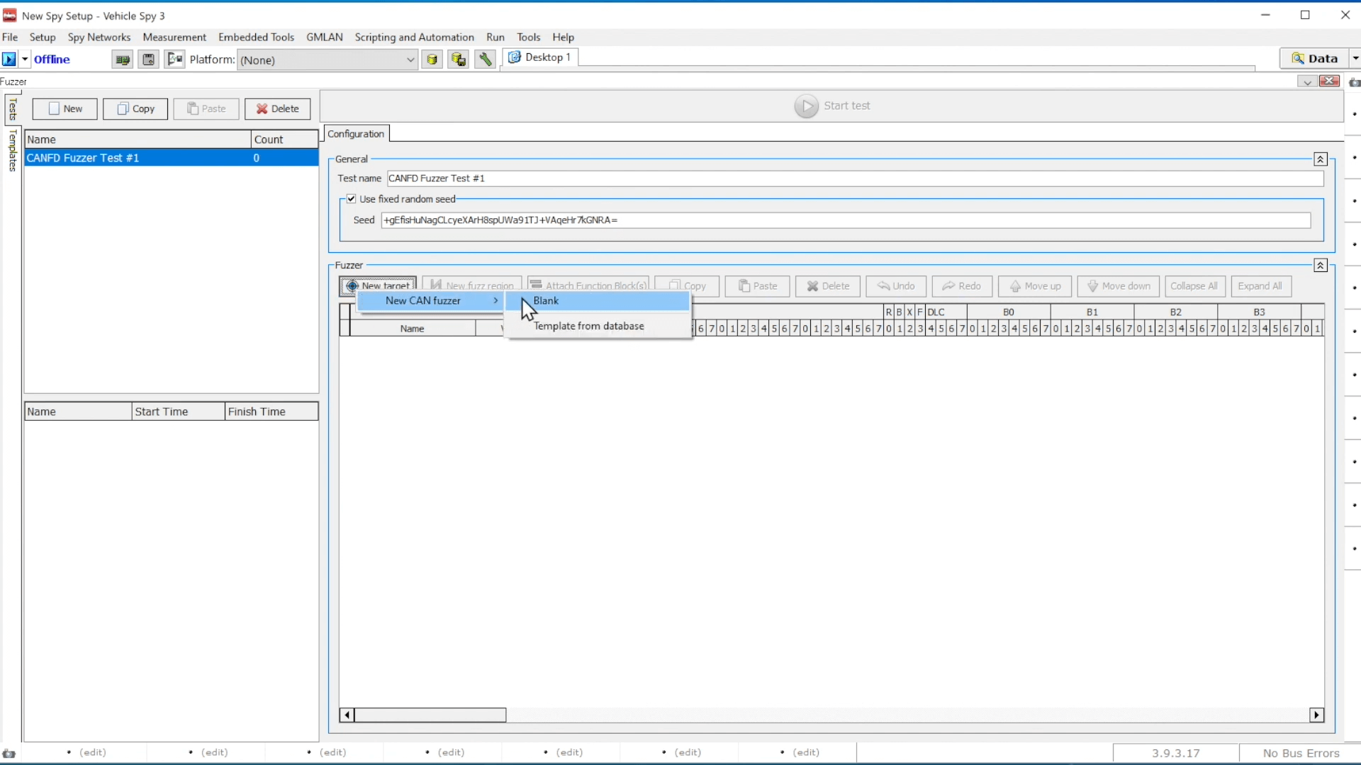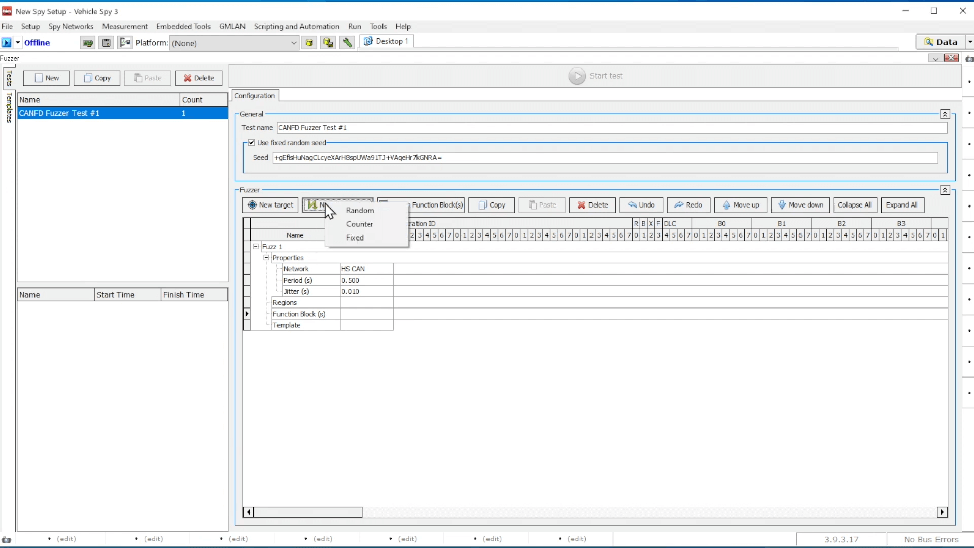 Fuzzing involves the creation of various test scenarios to assess system vulnerabilities. In the Fuzzer View, users can generate multiple tests by clicking the "New" button located in the top left corner. Each test can be named for easy identification and reference. Additionally, users can set a Pseudo Random Seed to ensure consistency in random data generation across multiple test runs. If no seed is provided, Vehicle Spy will generate a pseudo-random seed automatically.