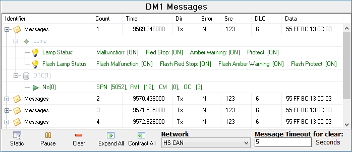 The DM1 Messages area in Figure 2 is similar to the Messages view, but is filtered to only show DM1 messages. The Static/Scroll button toggles the view to scroll DM1 messages down the screen or keep them displayed in fixed locations based upon their source address. The Pause/Start button freezes and unfreezes the view. The Clear button clears the view, while leaving the Messages buffer unaffected. The Expand/Contract All buttons expand and contract all tree branches in the viewing area by controlling their +/- twisty buttons.