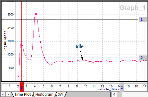 The Data Analysis plotter graphs channels (or signals) found in data files. The plotter has many features giving it the flexibility to fit your needs. To graph a channel simply select a data file and a channel in the Tool Dialog. The channel can also be dragged and dropped from the Tool Dialog into the plotter. The x and y axes will automatically adjust to fit the data. In Figure 1 the two vertical lines numbered 1 and 2 are adjustable time cursors. Time cursors can help pinpoint data, assist with zoom control, and analyze channel statistics. A time cursor is activated using keyboard hotkeys 1 or 2 or by clicking on its handle with the tip of the mouse cursor. An active cursor will turn red and can be moved by double clicking on the plot or using drag and drop on its handle. The Messages view will synchronize in time with the current location of the active cursor. ICS licensed 3G hardware (FIRE, Red, Yellow, VCAN3) must be connected for the time synchronization feature to work.