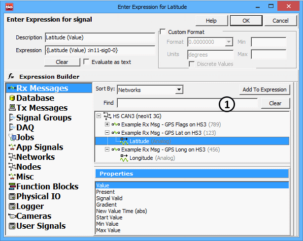 The GPS messages and their signals must first be defined in Vehicle Spy's Messages Editor Receive or Database views. Once defined, the GPS signals can then be assigned to the GPS Maps Latitude and Longitude expressions by clicking their fx button (Figure 2:) and using the Expression Builder. (Figure 4)