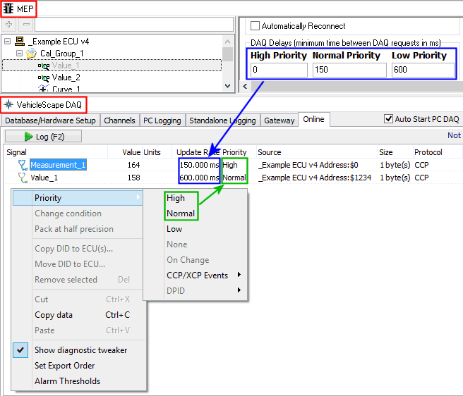 Figure 1: Standard DAQ'ing with CCP/XCP is established with DAQ Delays in MEP being assigned to A2L item priorities in VehicleScape DAQ.