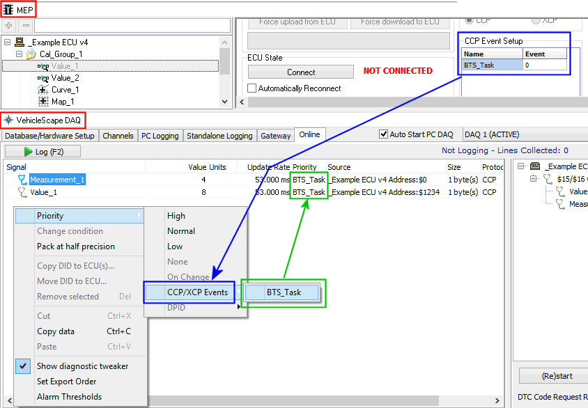 Figure 2: Event based DAQ'ing with CCP/XCP is established with events in MEP being assigned to A2L items in VehicleScape DAQ.