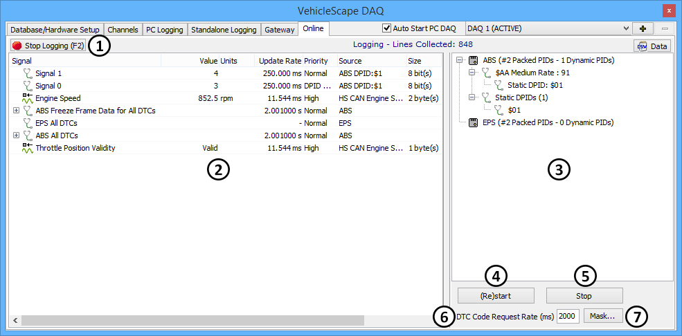 The Online tab is where all of the configuration work and settings in VehicleScape DAQ come together for PC Logging. Switching from other VehicleScape DAQ tabs to this one will automatically take Vehicle Spy online. Depending on the selected settings, logging may or may not automatically commence as well.