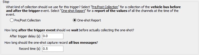 When using the Message Capture method for Standalone Logging within VehicleScape DAQ, selecting Using Trigger Expression for the Collection Start Option causes the Collection Configuration to consist of two options: Pre/Post Collection and One-shot Report (described here). The One-shot Report is also used for the Bus Query method.