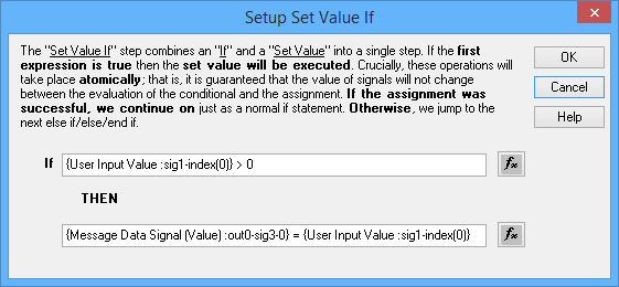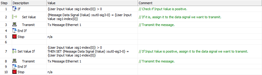 The script in Figure 1 checks if an application signal called User Input Valueis positive in step 1, and if so, assigns it to a transmit message signal in step 2 before sending the message. The intent, then, is only to send the data ifUser Input Value is positive. It is possible, however, that this value might have changed between these two steps (perhaps by a differentfunction block script) which could result in transmitting the message with a negative value. Using a Set Value If statement instead, as in step 7, ensures that this will not happen.