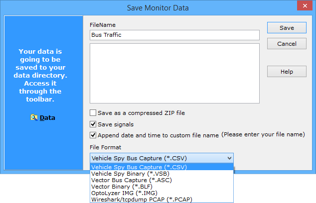 The buffer file can be saved in a .CSV or .VSB file format, among others. .CSV (Comma Separated Value) is a common format that can be read by many applications and it can also include signal data and a text note. .VSB (Vehicle Spy Binary) format is readable by Vehicle Spy and does not include signal data or notes. .VSB files have smaller memory size than .CSV files, so .VSB format can be useful when saving very large message buffers.