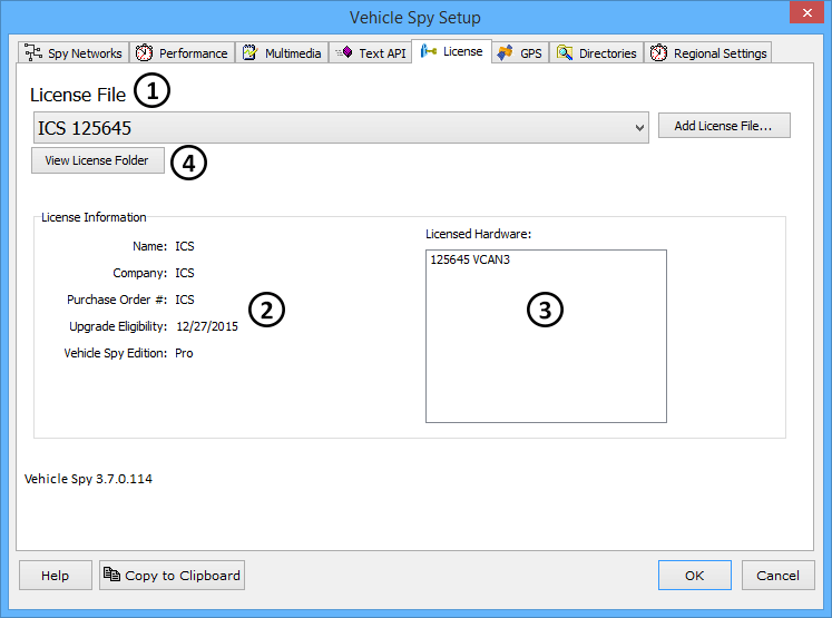 To transfer a Vehicle Spy license to another computer, simply copy the *.LIC file to the new computer and set up the License tab as described above. Vehicle Spy will be unlocked if a licensed hardware unit is connected.