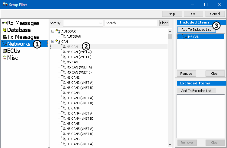 Filters choose what is to be captured. Under the Filter tab click the Filters... button (Figure 1: ). The Setup Filter dialog will appear (Figure 2). To create a filter for only HS CAN, select Networks (Figure 2:) > HS CAN (Figure 2:), and click Add To Included List (Figure 2:). OK will close the dialog.