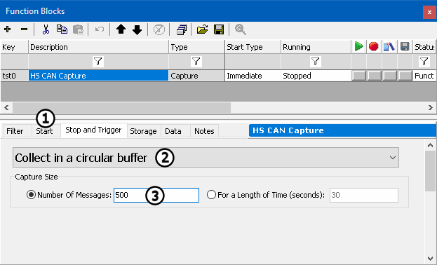 Click the Start tab (Figure 3:) and make sure that the Function Block is set to Start Immediately. Next, click on the Stop and Trigger tab. Select Collect in a circular buffer from the dropdown (Figure 3:).Enter 500 for the buffer size (Figure 3:). This is approximately the number of HS CAN messages in the simulation file.