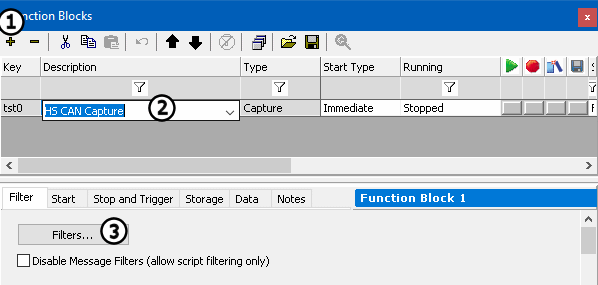 Press the + button (Figure 1:) at the top of Function Blocks view. A dropdown list of available function block types will appear. Select Capture and the new function block will be added to the list in the upper portion of the view. Label this Capture HS CAN Capture by double clicking the description field and entering in the text (Figure 1:).