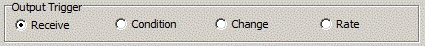 Unique to the Output Setup are the options for an output trigger. There are four options to trigger the transmission of a gatewayed message, Recieve, Condition, Change, and Rate. The Recieve option is selected by default and is the most basic option of the four; when the specified input message is received, it will be gatewayed. Next, the Condition option allows a condition to trigger the output message. For example, a message could be triggered to output only when its input message has been transmitted 10 times. The condition is set using the rules and logic of the Expression Editor. The 'Change' trigger simply outputs the message when the input messages data changes, and, finally, the 'Rate' trigger will output a message at either the rate of the input message, or at a specified rate.