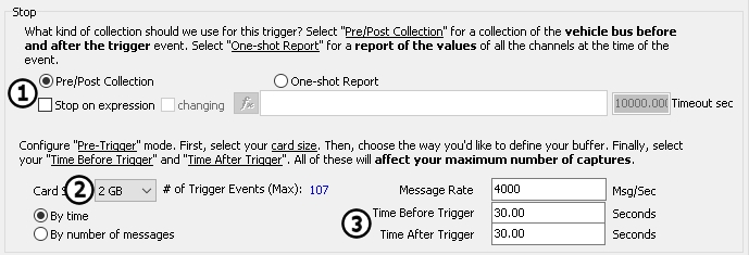 ). Besides selecting a number from the dropdown you may enter any number of your choice by clicking inside the drop down box. You can also choose a time length before and after the defined trigger. The number in blue reflects the total number of captures that can be saved before the SD card is full. If you require more captures, you must reduce the total number of messages in each capture.