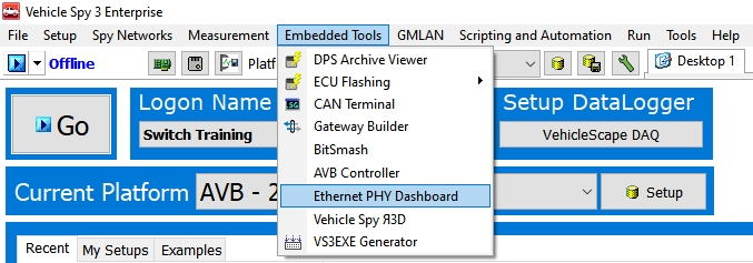 The PHY Dashboard can be opened from the Embedded Tools menu in Vehicle Spy (shown below)