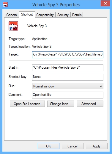 The command switch is setup using Windows Shortcut properties. Right click on a Vehicle Spy 3 shortcut and select properties. Changing the target from, "C:\Program Files\Vehicle Spy 3\vspy3.exe" to (where "XX" is the desired view), "C:\Program Files\Vehicle Spy 3\vspy3.exe" /VIEWXX will show the selected view and will prevent the user from changing the view. Adding the file name to open will open the specified file to the selected view. "C:\Program Files\Vehicle Spy 3\vspy3.exe" /VIEWXX c:\TestFileToOpen.vs3