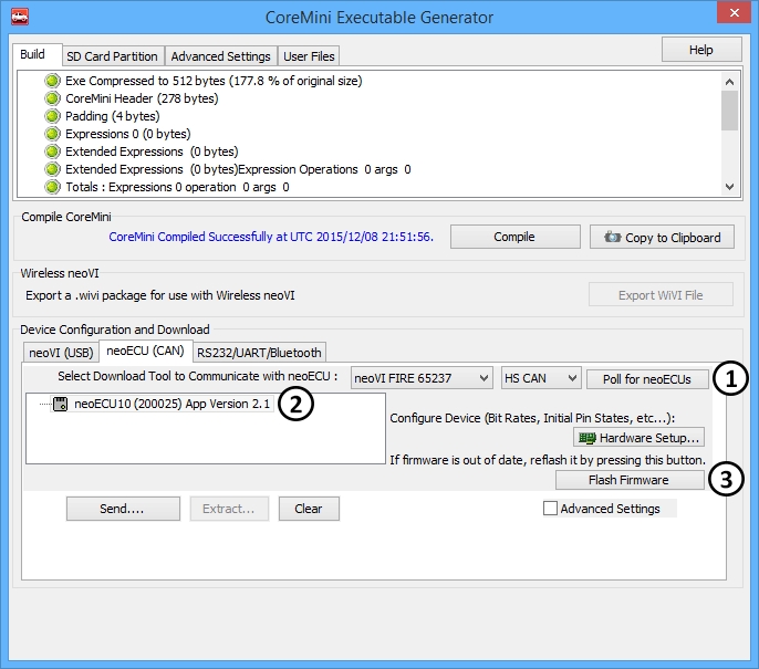 For CAN type neoECU devices, open up the CoreMini Console (found under Tools --> Utilities then CoreMini Console). Click on "Poll for neoECUs" (Figure1: