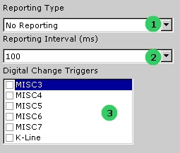 You can setup the general IO to be automatically reported to the host in neoVI explorer (figure 2). You can setup the general IO to be reported at an interval or based on digital inputs changing (figure 2 : bubble 1). The report will be sent to the host as a neoVI Device Virtual Network message. When reporting based on interval is selected you can select the interval from the drop down box shown in bubble 2 in figure 2. You can select an interval from 1 to 125 ms. If you selected a report based on digital change, you can select both an interval the inputs are tested (figure 2 : bubble 2) and which digital inputs to test (figure 2 : bubble 3). You can select as many as are listed. The report based on digital change will "de-bounce" the reading by testing the inputs twice. Each test will occur at one-half the time interval.