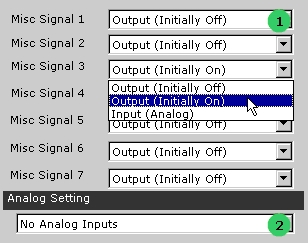 If setup as input, MISC pins 3 through 4 can be setup as analog inputs. You can setup analog inputs via the "Analog Setting" drop down (figure 1 : bubble 2). The settings are : 1) no analog inputs, 2) analog input on MISC 3, and 3) analog inputs on MISC 3-6. When setup for MISC3, the sampling rate will be once per millisecond. If the setting is for MISC3-6, the sample rate will be every four milliseconds. When using the MISC3-6 settings you can set an MISC3-6 pin for output. When you do this the pins output state will be sampled.