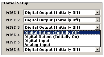 The MISC IO are setup in the neoVI 3G Explorer. Figure 1 shows the input output configuration. This is done by selecting Initial Values under MISC IO from the tree. On the panel shown, you can setup the direction, type, and initial state of each IOpin.