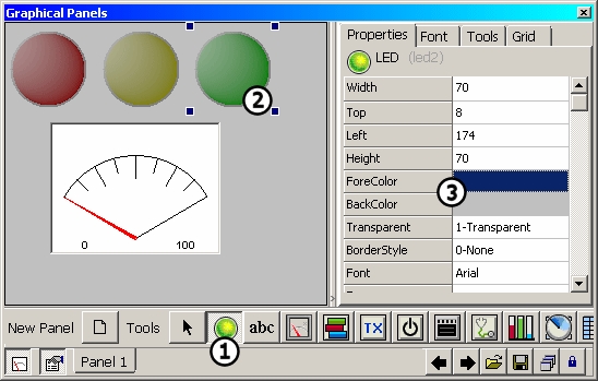 ). Here you can view and change the properties of the currently-selected tool, or switch to other tabs to help you build and adjust your graphical panel. A full description of these tabs can be found in the discussion of Tool Properties.