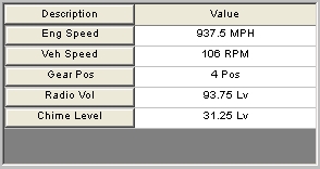 The Grid control is a quick and simple way to view multiple data elements in tabular fashion within a graphical panel (Figure 1). The data to be displayed is selected by choosing a signal group; these groups can be configured using the Signal List or Signal Plot features of Vehicle Spy. The divider between the signal descriptions and values can be moved by clicking and dragging.