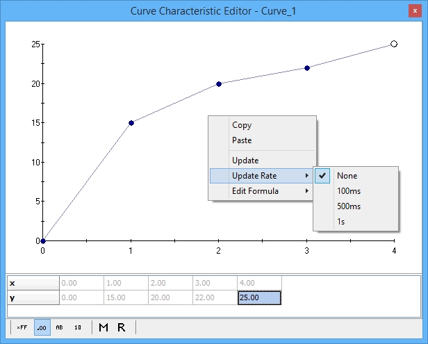 Use the MEP Curve Editor (Figure 1) to view and edit calibration curves from ECUs that support CCP/XCP. Open the Curve Editor with the Measurement --> MEP menu or by double clicking on curve items in the A2L file data item tree on the MEP Setup view.