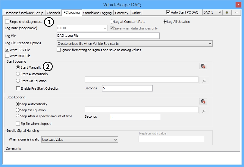 The PC Logging Tab (Figure 1) determines log file parameters, when to start and stop logging, and how to handle invalid signals. The interface is almost identical to that of the Logging view, with a couple of exceptions: