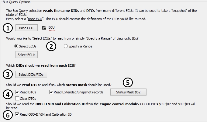 Read DTCs: Log all DTCs from all chosen ECUs if the DTC passes the Status Mask filter. (This must be checked or the other options here will be grayed out.)