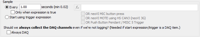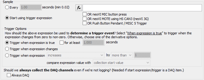 When enabled, always request DAQ items even if they are not being logged. Requested DAQ items are diagnostic signals that get polled from ECUs like DTCs, PIDs, ISO 14229 IDs, and MEP A2L file data items. This must be enabled if the trigger is a DAQ item.