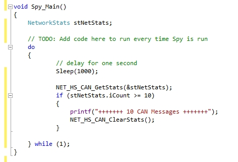 For each Network in Vehicle Spy there is an int variable. This variable is the number you use to reference a network. For example, the GenericMessage structure includes an iNetwork property. This indicates what network the message is from or will be transmitted to. All network indexes begin with the prefix NET_. Each network has statistics that you can access. You can access the statistics for a network with the GetStats function. You can reset the statistics with the ClearStats function.