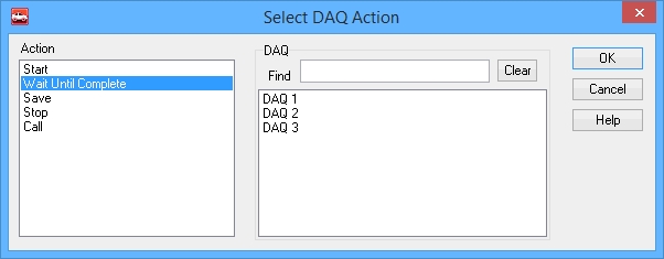 Allows you to select the DAQ to which the selected action should be applied. The DAQ jobs in the current Vehicle Spy setup will be listed in the white box on the right; simply click the one you want before pressing the OK button. The Find box allows you to more easily find the right DAQ in setups where there are many. Type a string in the box to filter the list of DAQ configurations shown in the selection box, so that only those that match appear. Press Clear to resume showing all DAQ setups again.