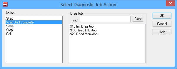 Allows you to select the diagnostic job that this command should act upon. The diagnostic jobs in the current Vehicle Spy setup will be listed in the white box; simply click on the one you want and then press the OK button. The Find box allows you to more easily locate the right job in large setups. Type a string in the box to filter the list of diagnostic jobs shown in the selection box, so that only those that match the entered string appear. Press Clear to resume showing all diagnostic jobs again.