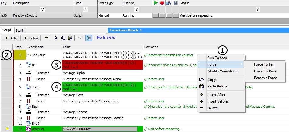 To force a command, select it and then bring up the right-click menu, hover over Force, and then choose either Force to Fail (which sets the condition to False) or Force to Pass (which sets the condition to True). Vehicle Spy indicates that forcing is in effect by highlighting a Force to Fail in red, as in step 2 of our example (Figure 3: