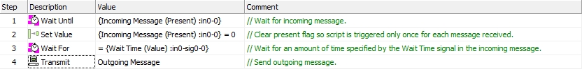 One of the most common actions in a function block script is to wait for receipt of a message before executing a block of code. To aid in this, each message has associated with it a property called the Present flag. This variable is set to False (0) when Vehicle Spy starts, and then changed to True (1) when a message is received, indicating that the message is now present.