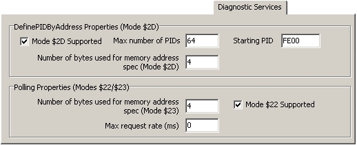 The Diagnostic Services tab contains other information about the ECU. The DPIDs area allows the user to specify the number of Dynamic and Static DPIDs the ECU supports. This information is used when requesting DPID information in the VehicleScape DAQ view. Settings are also present for how Memory Data should be requested.