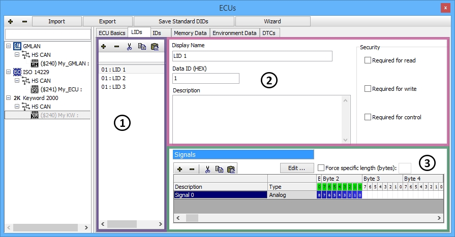 If a Keyword 2000 ECU is selected on the ECUs view then the tabs after the ECU Basics tab will look like those along the top of Figure 1. These other tabs let you create and change diagnostic items like LIDs, IDs, and Memory Data. Just click on a tab to see all items of that type in the ECU. A shared interface is used to enter data for the different types of items. The LIDs tab in Figure 1 is an example of this interface.
