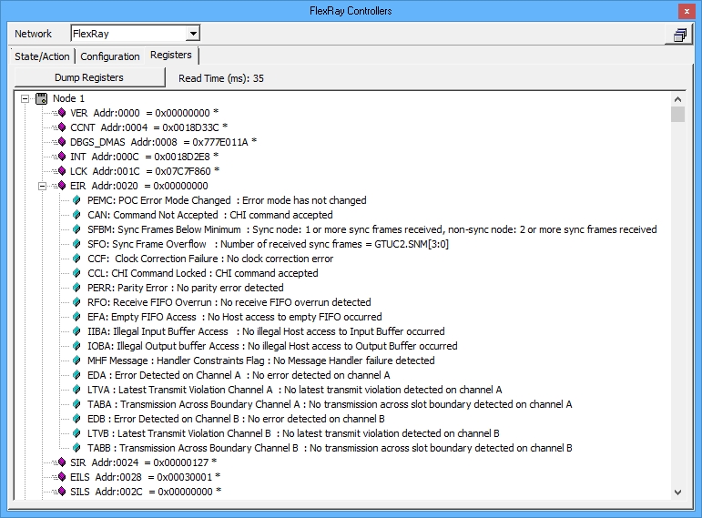 Use the FlexRay Controllers Registers tab to gather and view the memory register information from both FlexRay controllers onboard ICS hardware. Go online with the device and click Dump Registers to see the results from both nodes in a +/- tree.