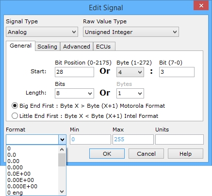 When decoding an analog or digital signal, the display format can be specified. For example, analog Engine RPM signal could be displayed as 1000.23423 or 1000.2. Many formats are available in the pulldown lists as shown in Figures 1 and 2.