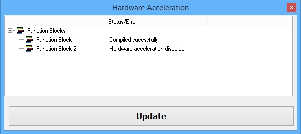 If you only need to periodically transmit messages as efficiently as possible then Hardware Acceleration can help by improving periodic transmit message timing accuracy and removing the need to use the CoreMini Console. The ICS hardware is accelerated by automatically running specific* periodic transmit function block scripts internally as CoreMini. This is more efficient than running those same scripts externally with Vehicle Spy through a USB connection. The Hardware Acceleration dialog in Figure 1 (found under Tools -> Utilities) shows which function blocks have Hardware Acceleration enabled. The Update button just refreshes the dialog display, it does NOT update the CoreMini logic in the ICS hardware. ALL of these conditions must be met to make Hardware Acceleration work: