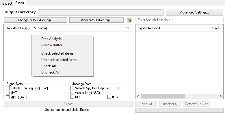 In the raw data VSB file list area there is a convenient right click menu available where an extracted VSB file can be quickly opened for further study with Data Analysis or Review Buffer. In the Signal Data checkbox area, the Force Rate value forces a periodic rate on all signal timestamps in the exported file. A value of -1 means the signal timestamps will be left untouched. That is, the signals in the exported file will use the timestamps from the VSB file.