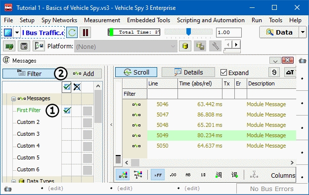 Now take a close look at the filter bar. The Custom 1 heading has been replaced by First Filter. Make sure that Vehicle Spy is started and then click inside the first column to the right of the filter name (Figure 2: