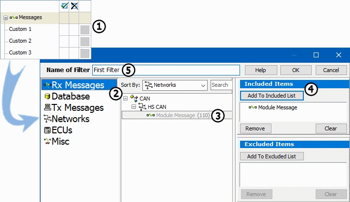 The Setup Filter dialog makes it easy to quickly set up a filter. At the left side of the dialog is a list of message sources. This enablesaccess to messages defined in the Messages Editor, entered in your database, etc. Make sure that the Rx Messages option is selected (Figure 1: