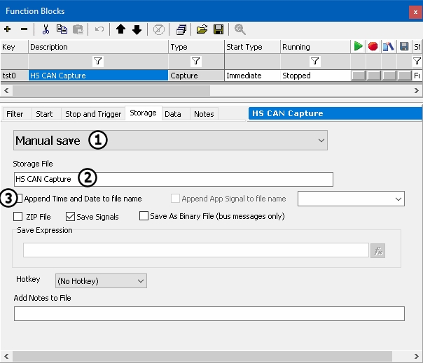 ). This will allow saving in a number of different ways. Give the storage file a name by changing the text from Capture File Function Block 1 to HS CAN Capture (Figure 5: