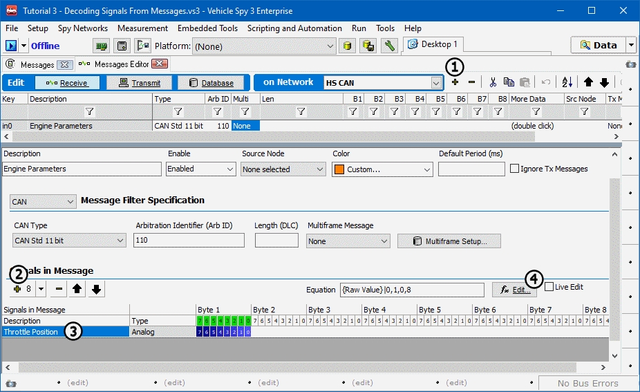 Open up the Messages Editor panel in the main workspace using the custom tab set or by selecting Spy Networks> Messages Editor. Define a new Receive message for HS CAN by selecting HS CAN from the on Network pull down and clicking the + button (Figure 1: