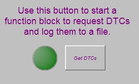 For this graphical panel, 3 tools will be selected from along the bottom of the screen and setup. The first is a Function Block Button to start the function block. The critical button properties to have set are: FunctionBlock: Check Codes and Log Them to a File FBlockAction: 0-Start This will cause the button to start the function block every time the button is clicked. Next, add an LED to let the user know that the code request is still in progress. Draw an LED and set the Signal property. Select the diagnostic job created under Jobs with the Is Running Property. Lastly, using a Text Display add some text to explain what the button does using the Caption property. Figure 1 shows a finished example.