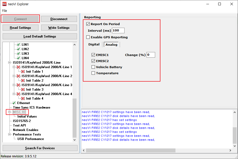 이후 시그널 값은 neoVI 채널(HS CAN 채널 X)의 Report Messages 메세지 안의 EMISC1 AIN, EMISC2 AIN 시그널로 수신됩니다.